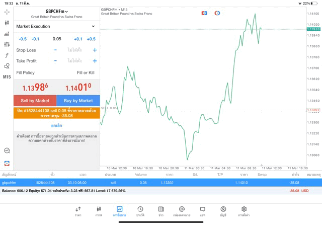 คลิ๊กปุ่มสีส้ม ปิดสถานะการเทรดครั้งนี้ที่ราคาตลาดด้วยการขาดทุน -35.08