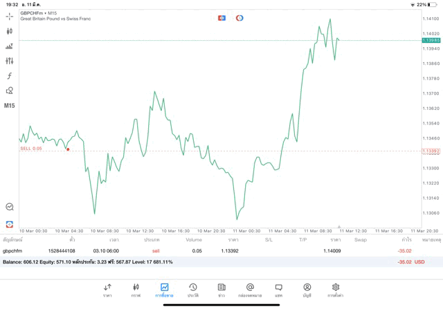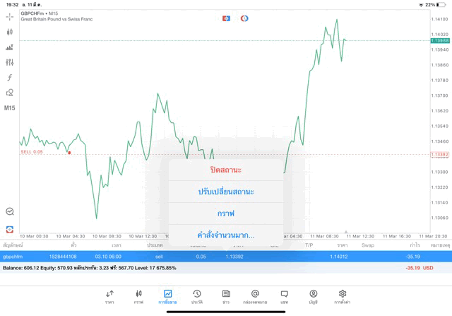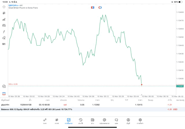 การเทรด Forex GBPCHFm 0.05 lot บนแอพเล่นหุ้น MT5 จะเริ่มขึ้นแล้ว หลังจากนักลงทุนกรอกจำนวน lot ที่ต้องการเทรดแล้วคลิ๊กปุ่ม Sell by market หรือ Buy by market การเทรดจะเริ่มขึ้น