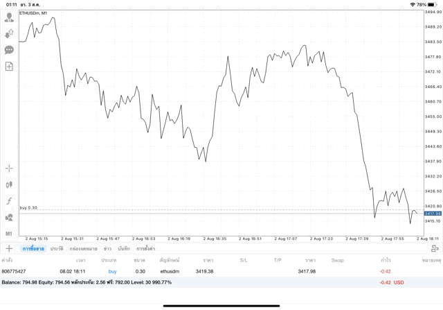 การเล่น Crypto ETHUSDm 0.3 lot leverage 1:2000ใช้ หลักประกัน (ประมาณ) 2.56 USD