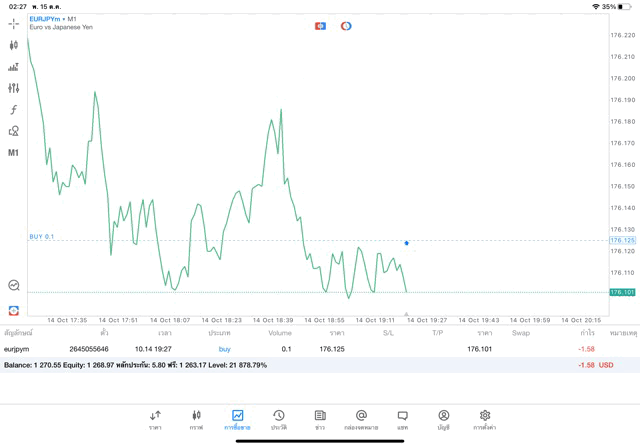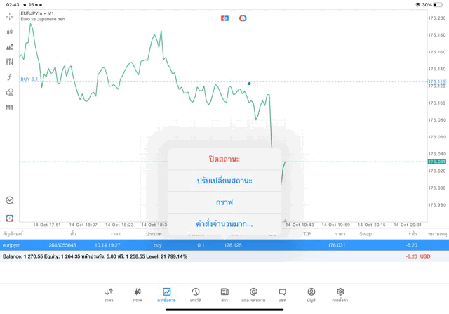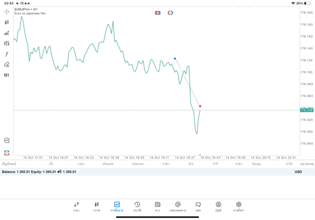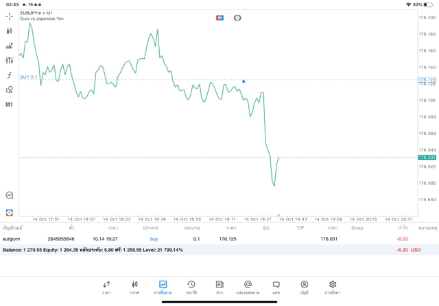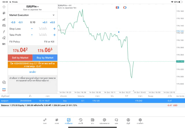 การเทรด Forex EURJPYm บนแอพเล่นหุ้น MT5 เริ่มขึ้นแล้ว ติดลบก่อน เมื่อเริ่มต้นเทรด รอเวลาผ่านไป หลังจากนี้นักลงทุนอาจจะ ได้กำไร หรือ ขาดทุน จากการเทรด forex EURJPYm